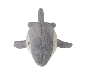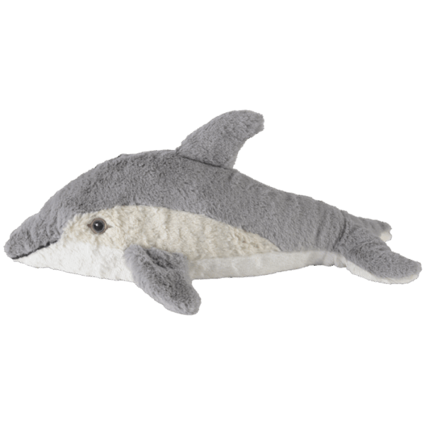 Deze pluizige dolfijn was ooit een ware avonturier – moedig, speels en altijd de eerste die door de golven sprong. Hij voelde zich vrij in de oceaan, maar er ontbrak iets. Op een dag zwom hij naar de kust, ging in de zon liggen en viel met een glimlach in slaap. Sindsdien weet dit vrolijke zeedier dat zijn ware roeping niet ligt in wedstrijdzwemmen, maar in het geven van een warm, knus gevoel aan anderen. Hij verruilde het geluid van de golven voor de geur van lavendel en werd wat hij vandaag de dag is: je trouwe, knuffelbare vriend die je verwarmt en troost, en dag in dag uit met je door het leven duikt. De dolfijn is ongeveer 338 cm lang en weegt ongeveer 710 gram.